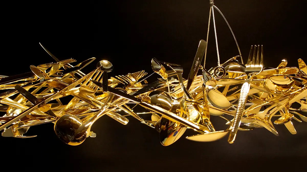Alltagsgegenstände werden aus Ihrem Kontext gelöst und zu leuchtenden Kunstobjekten, wie bei unserer „Besteckleuchte“ nach einem Gespräch eines Restaurantbesitzers.